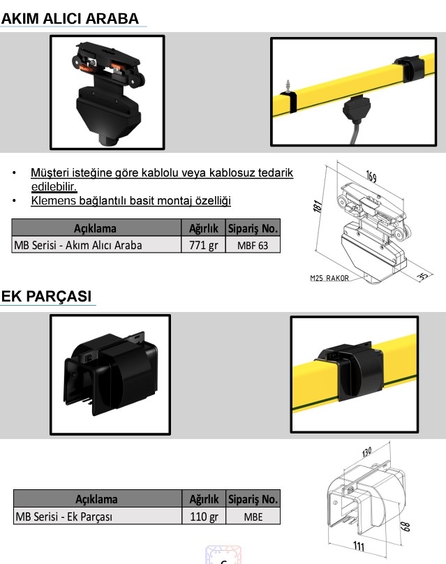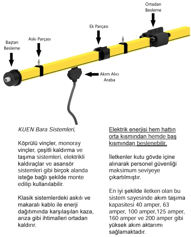 Bara sistemleri, köprülü vinçler, monoray vinçler, çeşitli kaldırma ve taşıma sistemleri, elektrikli kaldırıcılar ve asansör sistemleri gibi birçok alanda isteğe bağlı şekilde monte edilip kullanılabilir. Klasik sistemlerdeki askılı ve makaralı kablo ile enerji dağıtımında karşılaşılan kaza ve arızalar gibi ihmalleri ortadan kaldırır. Elektrik enerjisi hem hattın orta kısmından hem de baş kısmından beslenebilir. İletkenler, kutu gövde içine alınarak personel güvenliği maksimum seviyeye çıkarılmıştır. En iyi iletken özelliklere sahip bu sistem sayesinde akım taşıma kapasitesi, 40 amper, 63 amper, 100 amper, 125 amper, 160 amper ve 200 amper gibi yüksek akım aktarımını sağlamaktadır.